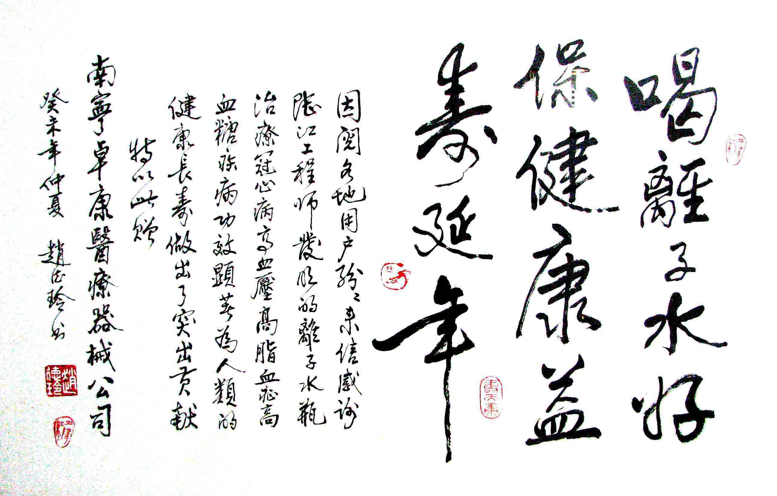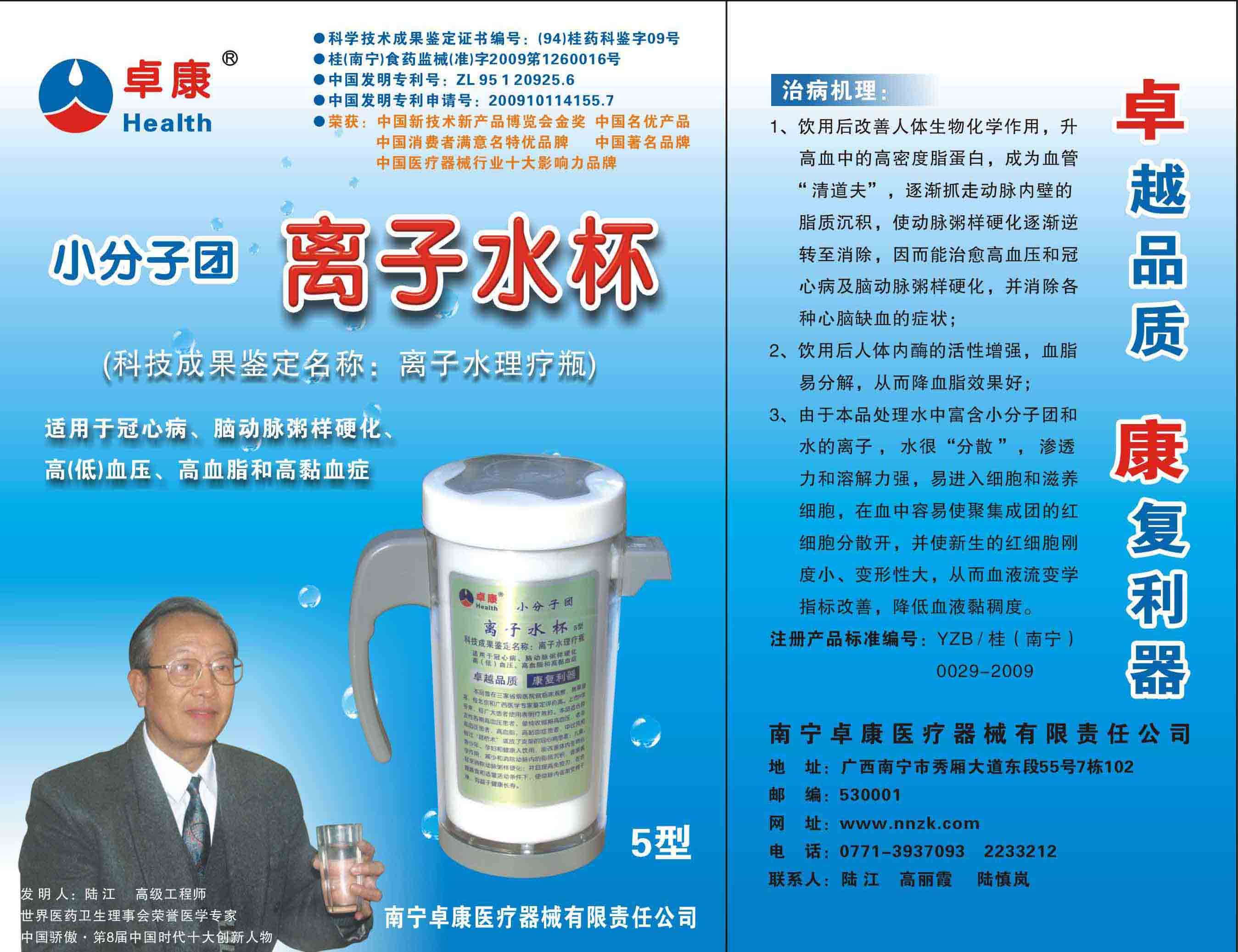 - -----南寧卓康微小水科技有限公司原為南寧卓康醫(yī)療器械有限責(zé)任公司 ,用戶普遍反饋高血壓患者飲用2—5個(gè)月,癥狀消除,不再服藥,治愈了高血壓; 冠心病患者,包括已做和未做支架或搭撟手術(shù)者,經(jīng)3—5個(gè)月飲用,消除心痛、胸悶、早搏、房顫和心絞痛等癥狀,逆轉(zhuǎn)至消除動脈粥樣硬化和斑塊,一年左右治愈冠心病,心腦電圖正常,經(jīng)冠脈造影掃描無明顯狹窄,表明冠心病痊愈;糖尿病人飲用3-10個(gè)月,血糖尿糖正常,治愈2型糖尿病; 并且使前列腺增生、低血壓、腦萎慢性咽喉炎、慢性氣管炎、支氣管炎、哮喘、矽肺病、甲亢、慢性胃腸炎、膽囊炎、慢性腎炎、腎衰、風(fēng)濕性關(guān)節(jié)炎、痔瘡和濕疹皮炎及中風(fēng)癱瘓或偏癱失語后遺癥等不藥而愈,且多病同治,無需終生服藥,彌補(bǔ)了幾千年來藥物的欠缺,使“微小水”成為人類消除高血壓、冠心病和糖尿病的寶貴資源。腦動脈粥樣硬化、低血壓和前列腺增生患者,一般飲用四個(gè)月痊愈;中風(fēng)后遺癥患者,一般飲用8個(gè)月痊愈。請?jiān)旈啞队脩舴答仭窓谀恐写罅炕颊叩姆答佇拧z測報(bào)告,有的還附照片。產(chǎn)品屢獲大獎,論文也屢獲一等獎。廣大用戶好評不斷,有口皆碑。